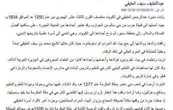 المؤرخ متعب عثمان السعيد يوثق لعائلة العتيقي في كتابه المشهور أنساب الأسر النجدية المتحضرة بالكويت