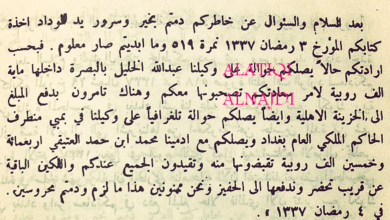 رسالة الشيخ سالم المبارك الصباح للمعتمد البريطاني بخصوص محمد بن حمد العتيقي